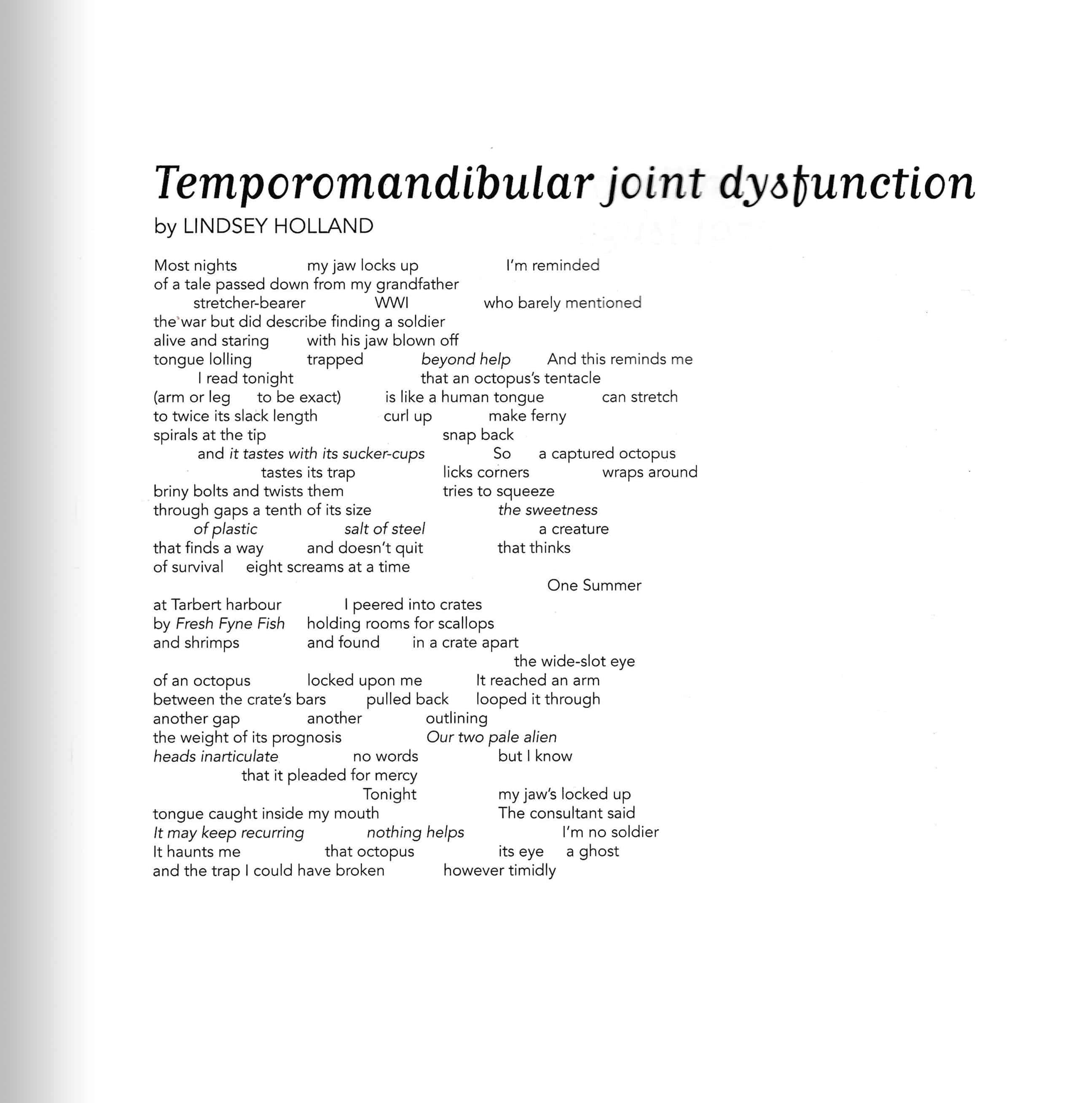 ‘Temporomandibular Joint Dysfunction’ was a finalist in the 2017 Mslexia Single Poem competition and appeared in Issue 75. Click the image on the right to read the poem (or below on mobile/tablet)
